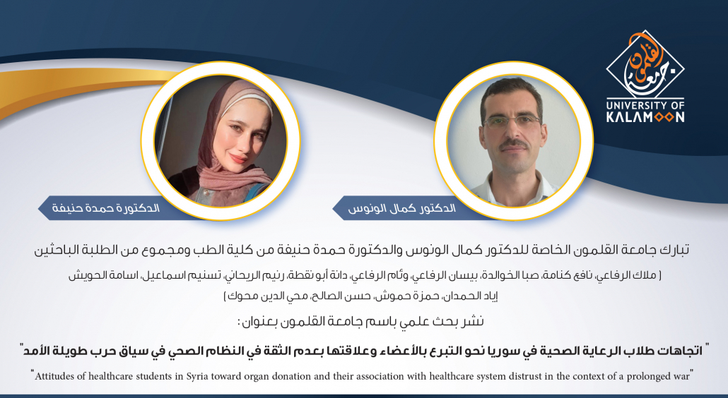 ” اتجاهات طلاب الرعاية الصحية في سوريا نحو التبرع بالأعضاء وعلاقتها بعدم الثقة في النظام الصحي في سياق حرب طويلة الأمد”