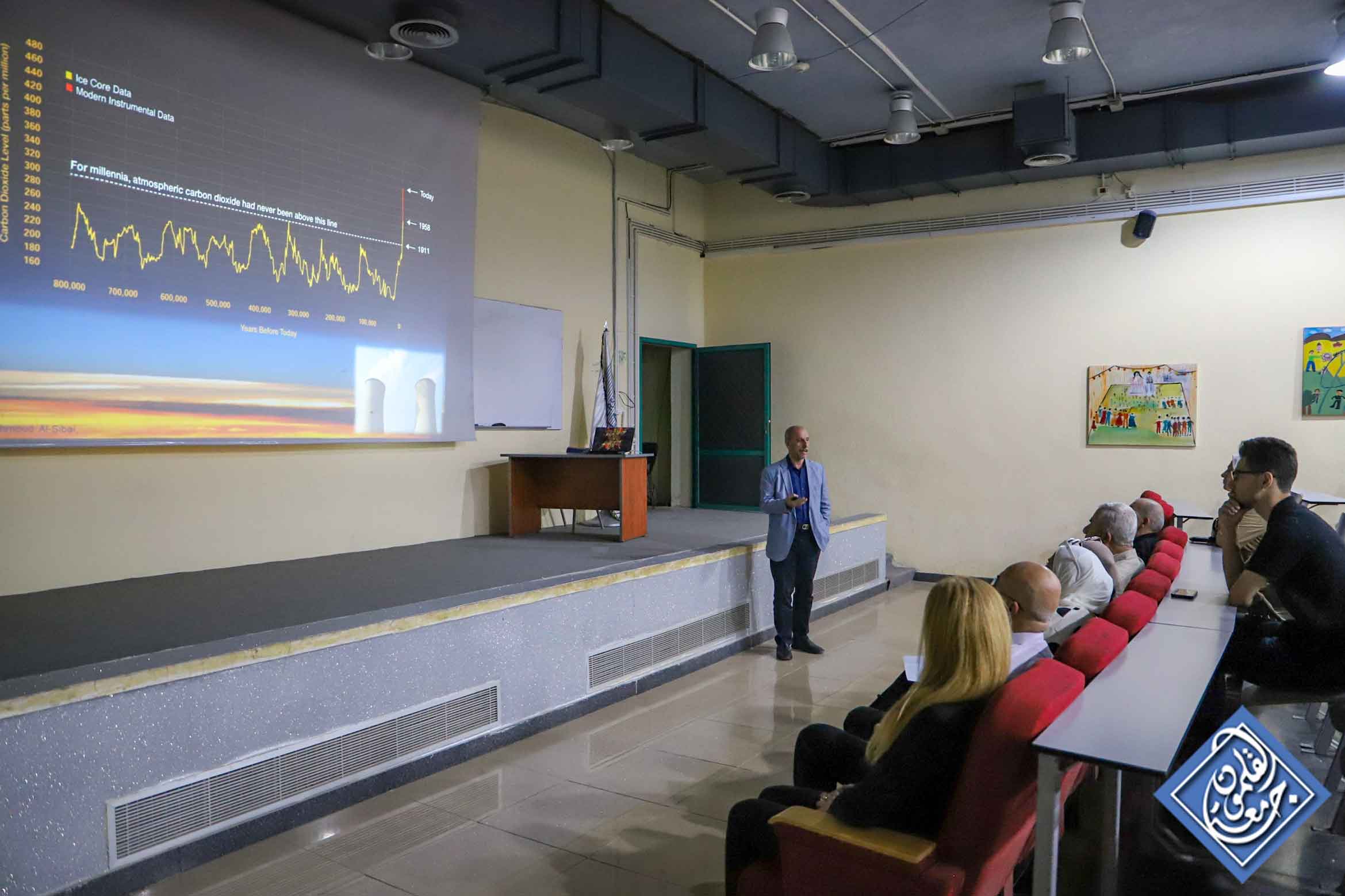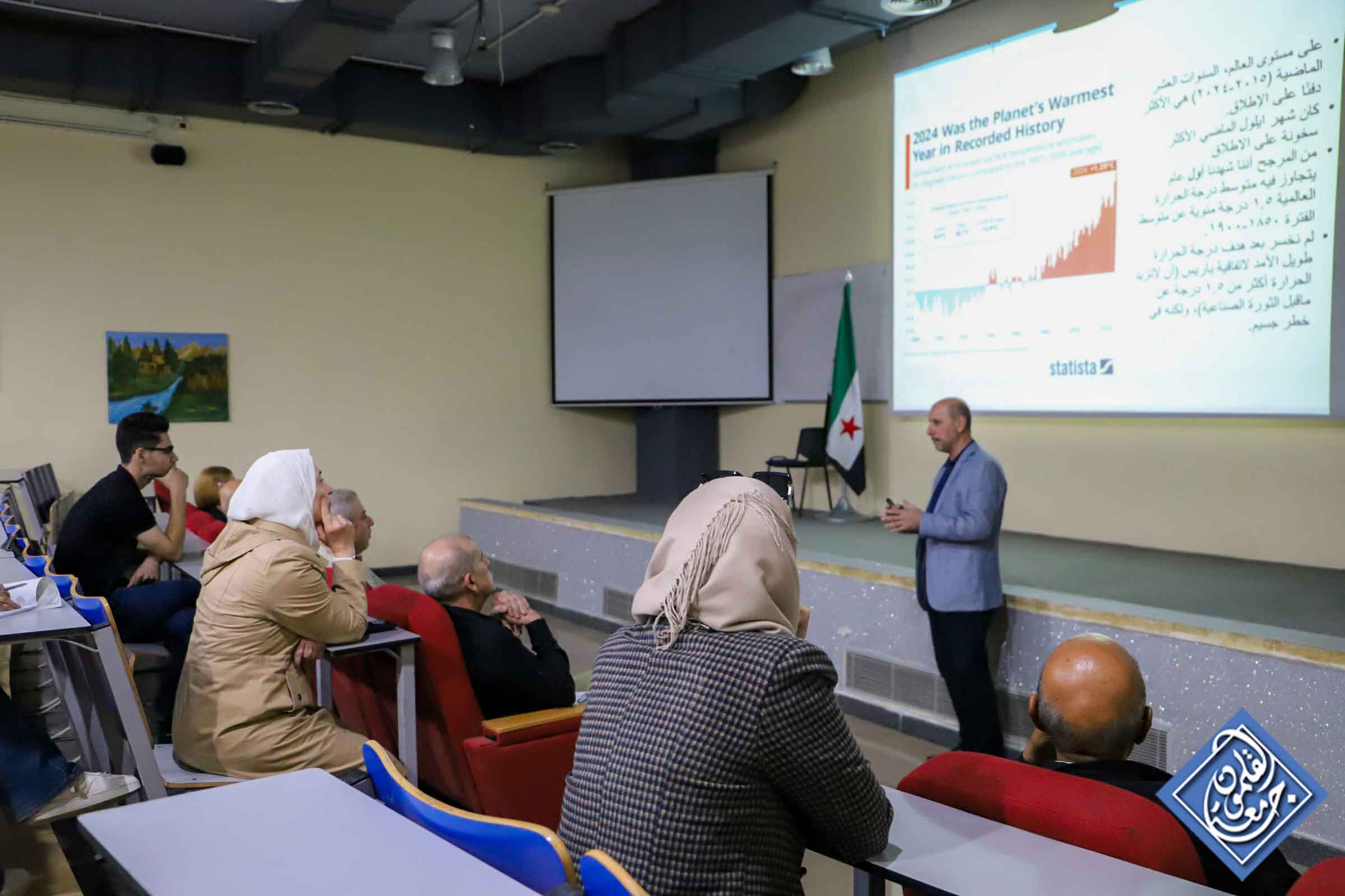 وفي إطار الجهود المبذولة لرفع الوعي البيئي في ظل المخاطر المتزايدة نتيجة التغير المناخي وتأثيرها على مواردنا المائية، قدم د.محمود السباعي مدير الجودة وعضو الهيئة التدريسية في كلية الهندسة المدنية والمعمارية محاضرة علمية تحت عنوان “التغير المناخي وآثاره على الموارد المائية، حالة نبع التنور”، تناول فيها أبرز التحديات التي يواجهها العالم نتيجة الاحتباس الحراري وتناقص مصادر المياه، وتأثيرها الخطير على منطقتنا، وخصَّ بالذكر نبع التنور المغذي الرئيسي لمحافظة حمص والذي انخفض منسوب المياه فيه لمستوى يعد الأخطر نسبةً للأعوام الماضية، كما شدد د.محمود على أهمية الحلول الاسعافية الحالية لتأمين إمدادات المياه على المدى القريب، وأكد على ضرورة وضع خطة استراتيجية لإدارة الموارد المائية على المدى القصير والمتوسط والطويل وتبني حلول مستدامة للحفاظ على الأمن المائي، والتعاون المجتمعي لمواجهة آثار الجفاف والتلوث،
