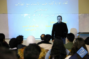افتتح د.فادي اللقاء مرحباً بالطلبة، ومؤكداً حرص الكلية على توفير بيئة تعليمية متطورة، تسهم في إعداد كوادر مؤهلة في مجال طب الأسنان، كما سلَّط د.أيهم الضوء على التطور التقني والأكاديمي الذي تتميز به الكلية منذ تأسيسها، مستعرضاً ما تضمه من مخابر حديثة وأجهزة ومعدات متطورة.