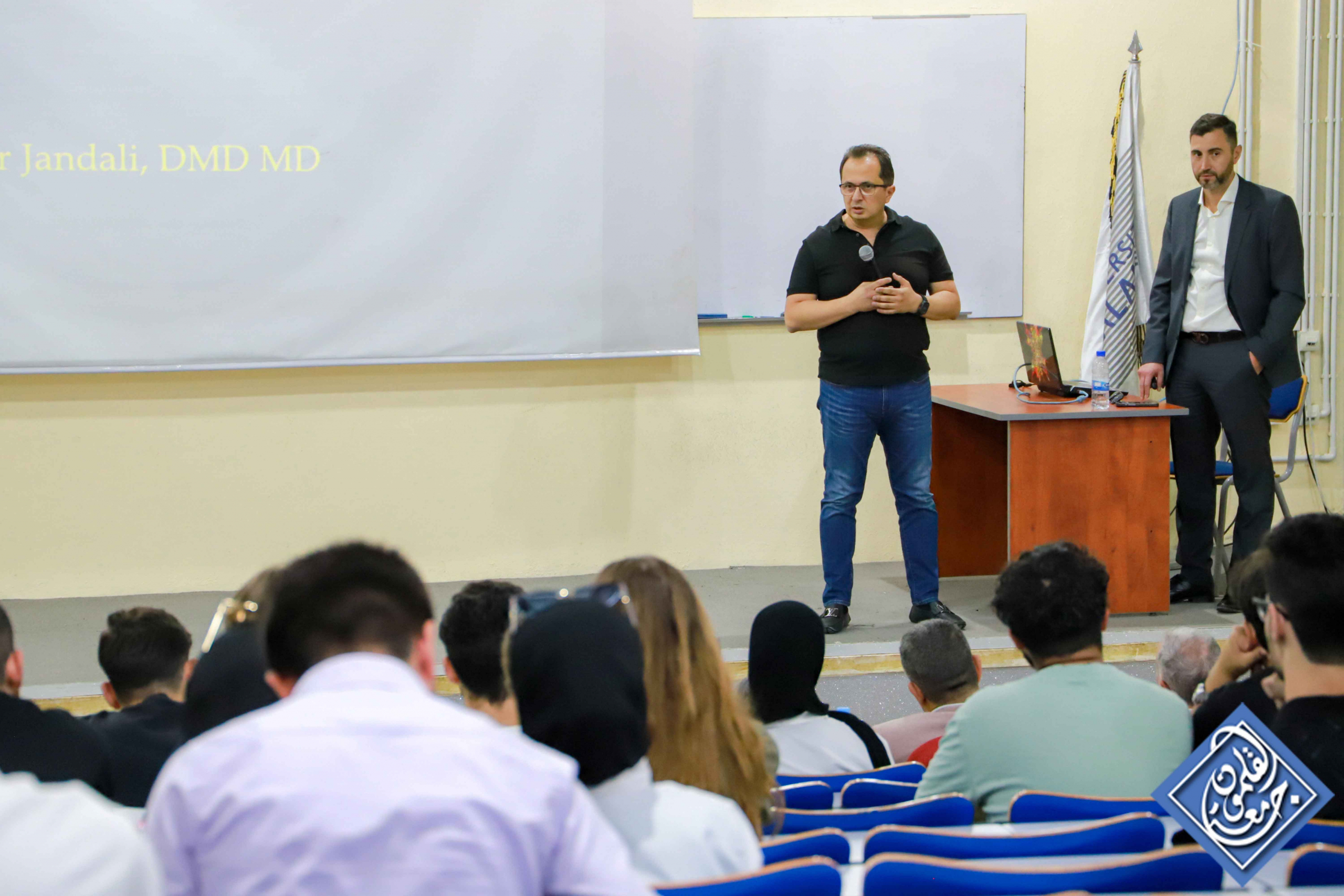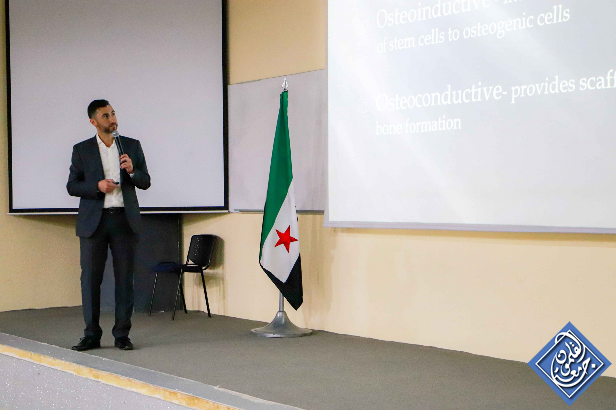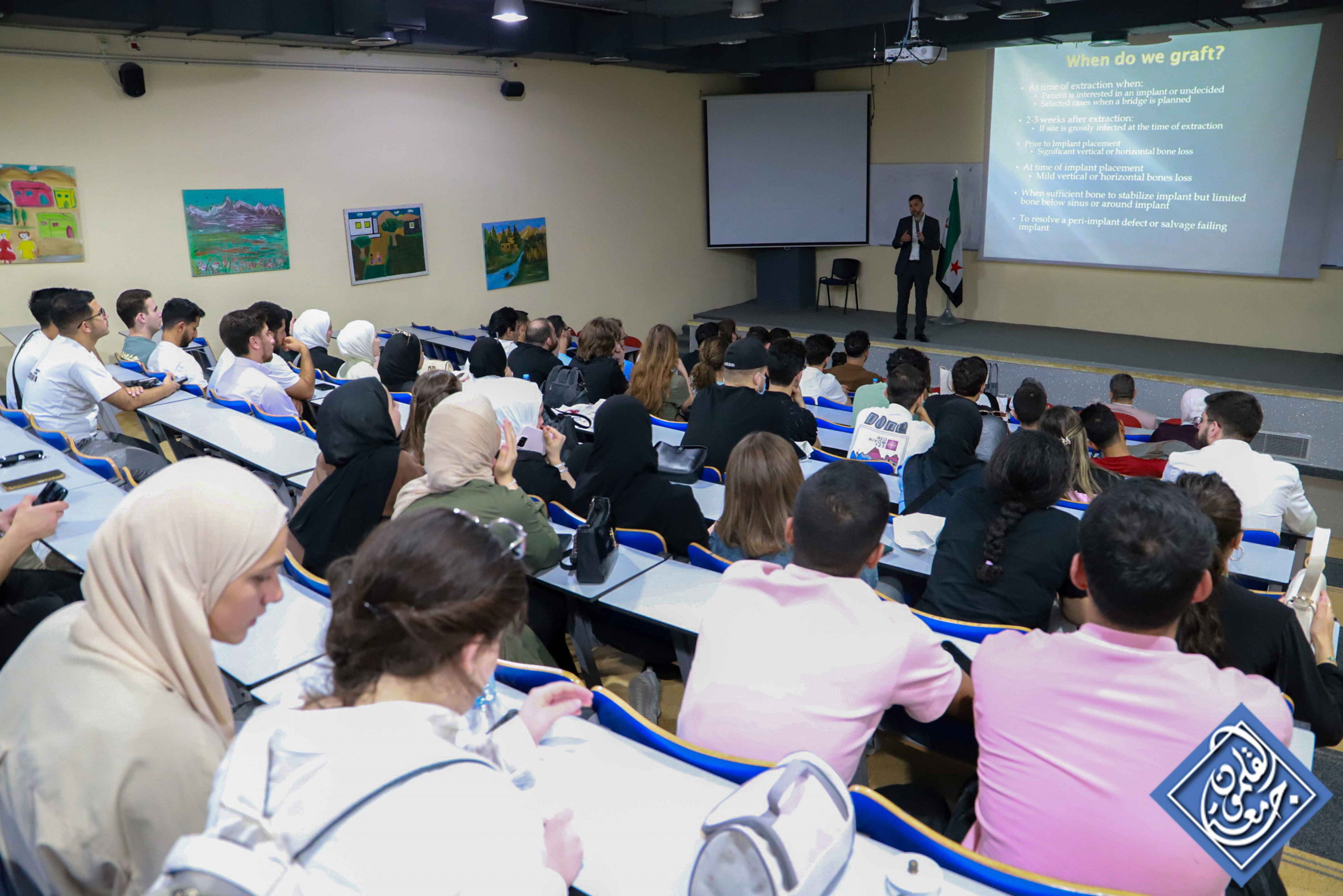 ضمن إطار تعزيز التعاون الأكاديمي و التبادل العلمي ، نظمت كلية طب الأسنان في جامعة القلمون الخاصة بالتعاون مع جمعية SAMS محاضرة علمية متميزة قدمها د.ماهر جندلي تحت عنوان ” الأساسيات في الطعوم العظمية “، والذي سلط الضوء على أحدث التطورات في مجال علاج الأسنان و تقنيات زراعة العظم داخل الفم، كما تطرق إلى شرح أنواع الطعوم وطريقة استخلاص واستخدام كل منها، وبيَّن كيف أصبح طب الأسنان اليوم يجمع بين العلم والفن لتقديم حلول علاجية ثورية، حيث تحولت التقنيات الحديثة المستخدمة في هذا المجال إلى أداة قوية تضمن علاجاً أسرع وأكثر دقة مع نتائج جمالية ووظيفية تفوق التوقعات، تأتي هذه الفعالية ضمن سلسلة من الأنشطة التي تهدف إلى تعزيز البحث العلمي و تعميق الفهم حول التحديات والحلول المتقدمة في مجال طب الأسنان، وذلك يوم الاثنين 30/9/2025 في المدرج الصغير، بحضور عميد كلية طب الأسنان د.فادي الجودة و عدد من الأساتذة وثلة من الإداريين والطلبة.