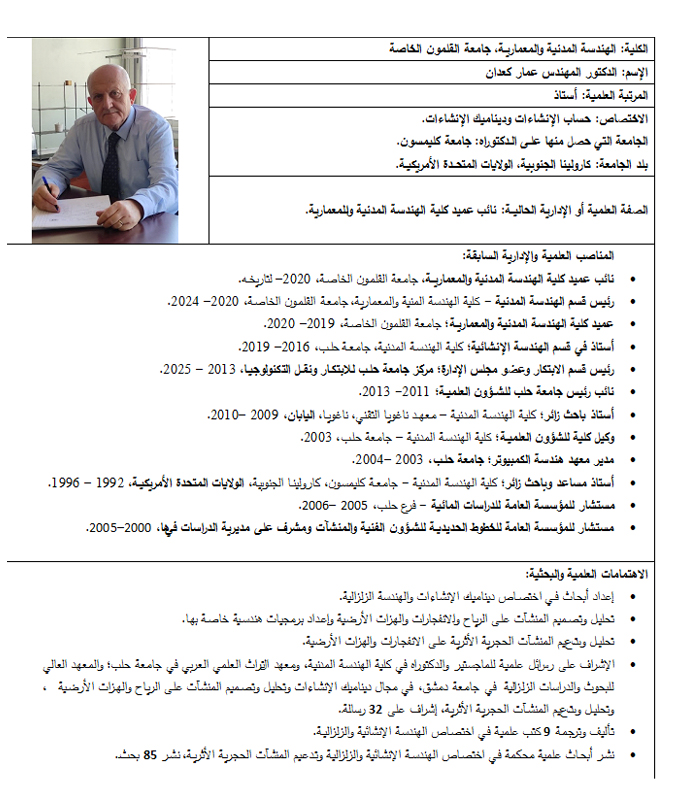 من دواعي سروري أن أرحب بكم جميعاً في كلية الهندسة المدنية والمعمارية في رحاب جامعة القلمون الخاصة، وأن نبدأ عامنا الأكاديمي الجديد بمشاركة لفيف من أعضاء الهيئة التعليمية من أساتذة ومهندسين متميزين في معظم الاختصاصات العلمية في مجالي الهندسة المدنية والمعمارية.