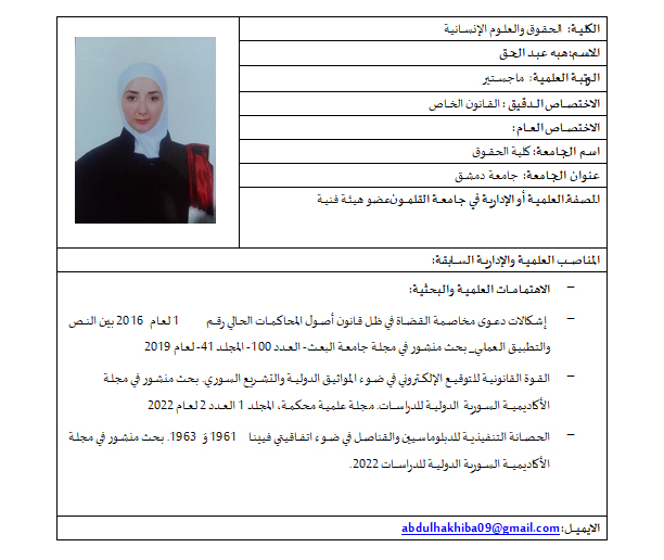 كلية الحقوق والعلوم الانسانية بجامعة القلمون: عمادة، وأعضاء هيئة تعليمية (تدريسية، وفنية من قضاة ومحامين …)، وهيئة إدارية، ترحب بكم في هذا المنبر الإلكتروني، والذي وُجد لتأمين التّواصل مع الأسرة الجامعية المكونة من أعضاء هيئة تعليمية وطلبة وأهالي ومهتمين بالشأن الجامعي والبحث العلمي، من خلال تزويدهم بما يلزم حول أنشطة الكلية وفعالياتها بغية ربط الجامعة بالمجتمع من خلال نقل المعلومات القيّمة عن أنبل نشاط بشري وهو نشاطُ العلم والمعرفة.