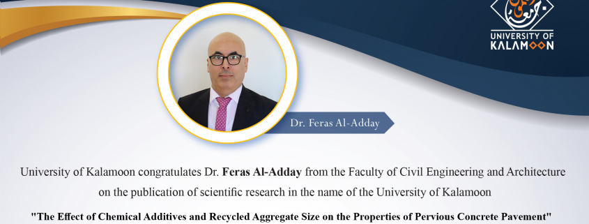 The University of Kalamoon extends its congratulations to Dr. Feras Al-Adday from the Faculty of Civil Engineering and Architecture has published a new scientific research paper, entitled “The Effect of Chemical Additives and Recycled Aggregate Size on the Properties of Pervious Concrete Pavement” in the International Journal of Masonry Research and Innovation (IJMRI), which is indexed in Scopus under the (Q3) with an Impact Factor of 1.1.